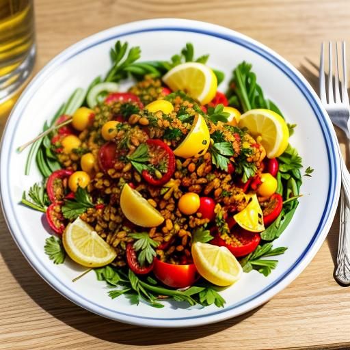 Ensalada de lentejas con vegetales frescos y aderezo de limón y aceite de oliva